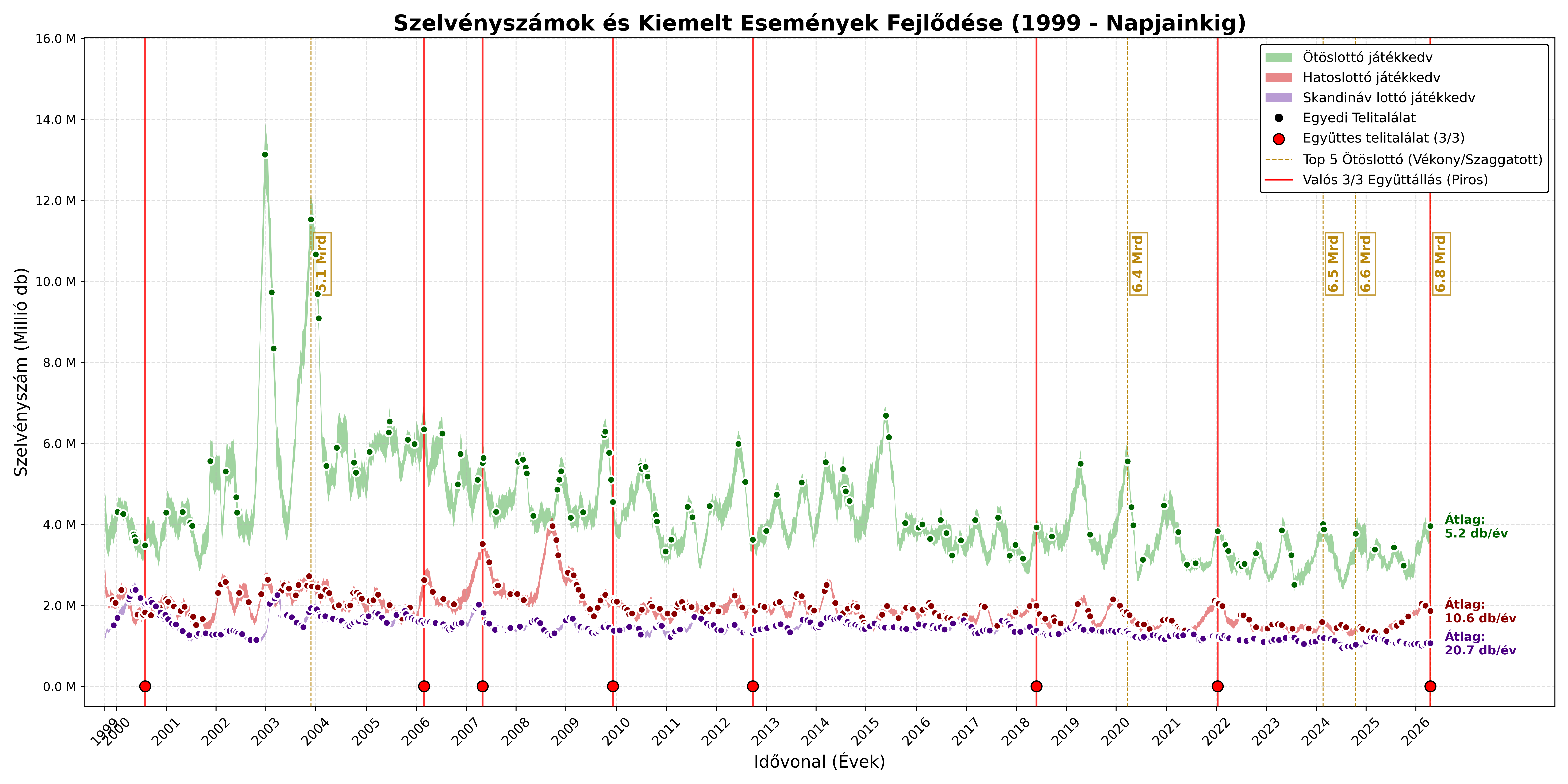 Kizárólag a 10. évet követő, stabil historikus időszakot alapul véve a magyar lottótörténelem kumulatív mutatói a három lottójáték együttes telitalálatára a következők: