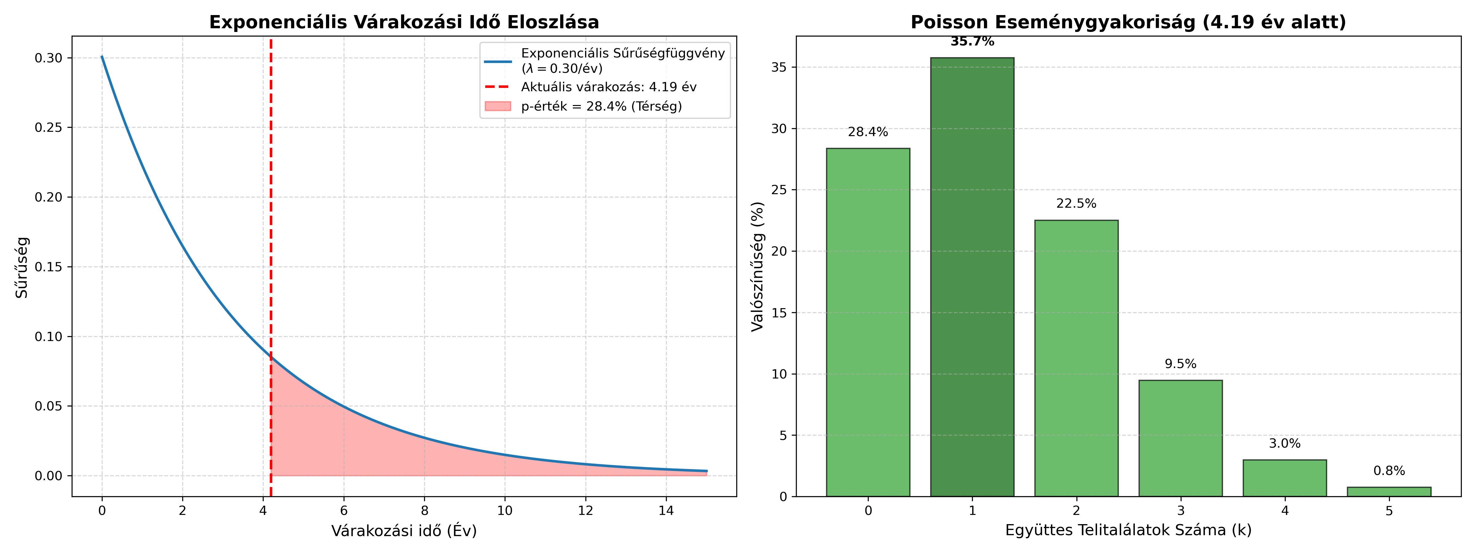 Exponenciális Várakozási Idő Próba: Mekkora a valószínűsége annak, hogy egy \(\lambda = 0.30\) rátájú folyamatban legalább 4.19 évet kell várni a következő eseményre? \[P(T \ge 4.19) = e^{-\lambda \cdot t} = e^{-0.30 \cdot 4.19} \approx 0.284\] A kapott \(p\)-érték 28.4%. Ez rendkívül erős eredmény, amely messze a \(0.05\)-ös kritikus határérték felett van. Statisztikailag teljesen valid, hogy több mint 4 évet kellett várni erre az együttállásra.