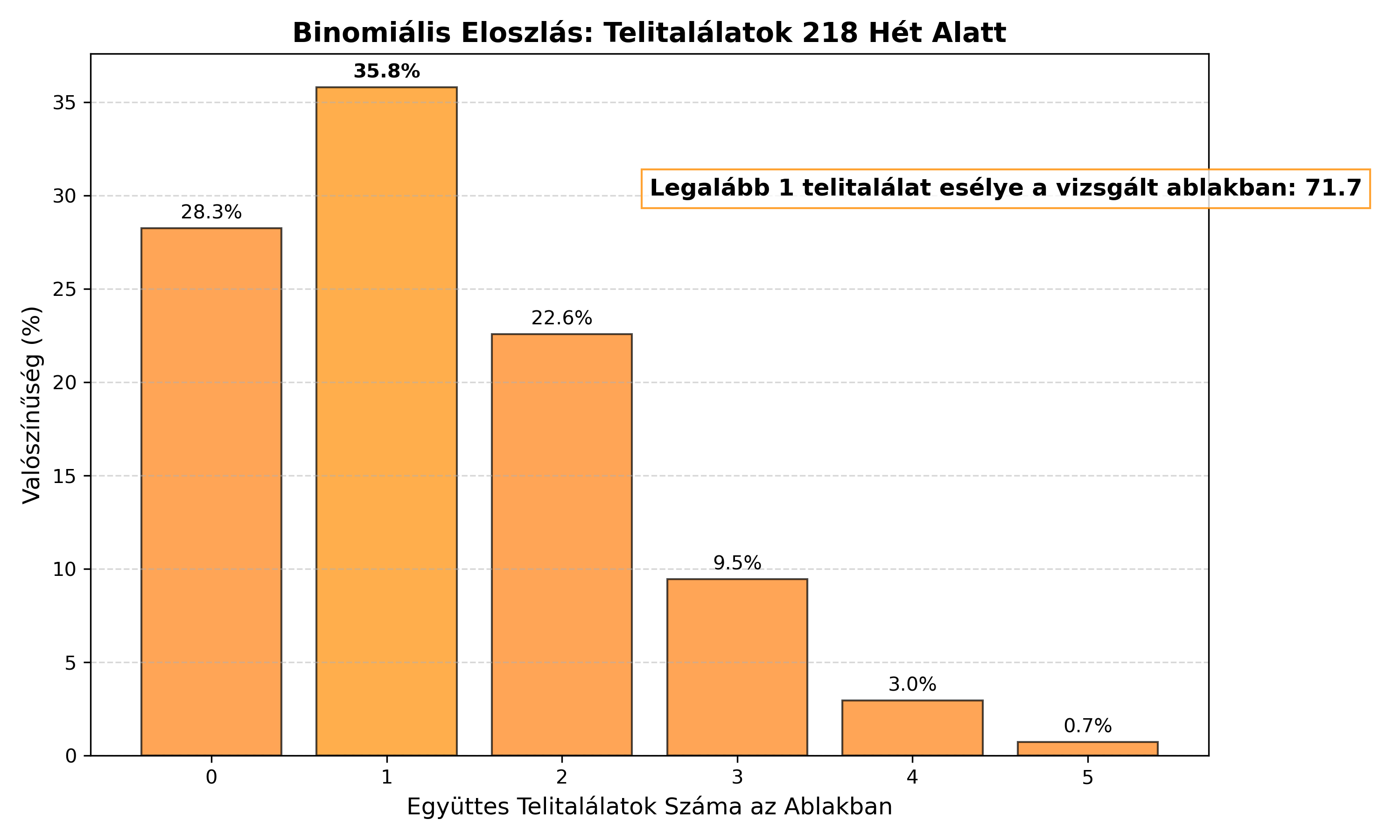 Eredmény: Az esély 71.74%. A számítás rávilágít, hogy egyáltalán nem “csoda”, hogy a 218 hetes ablak végén bekövetkezett a nyeremény. A valós anomália az lett volna (mindössze 28% eséllyel), ha ebben az egész négyéves ciklusban egyszer sem történik együttállás. A nullhipotézist (\(H_0\)) megtartjuk.