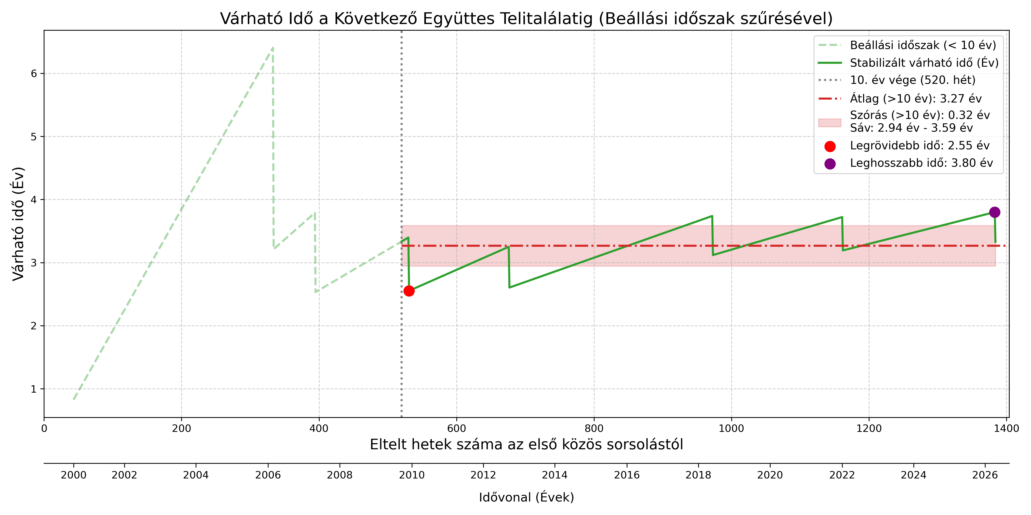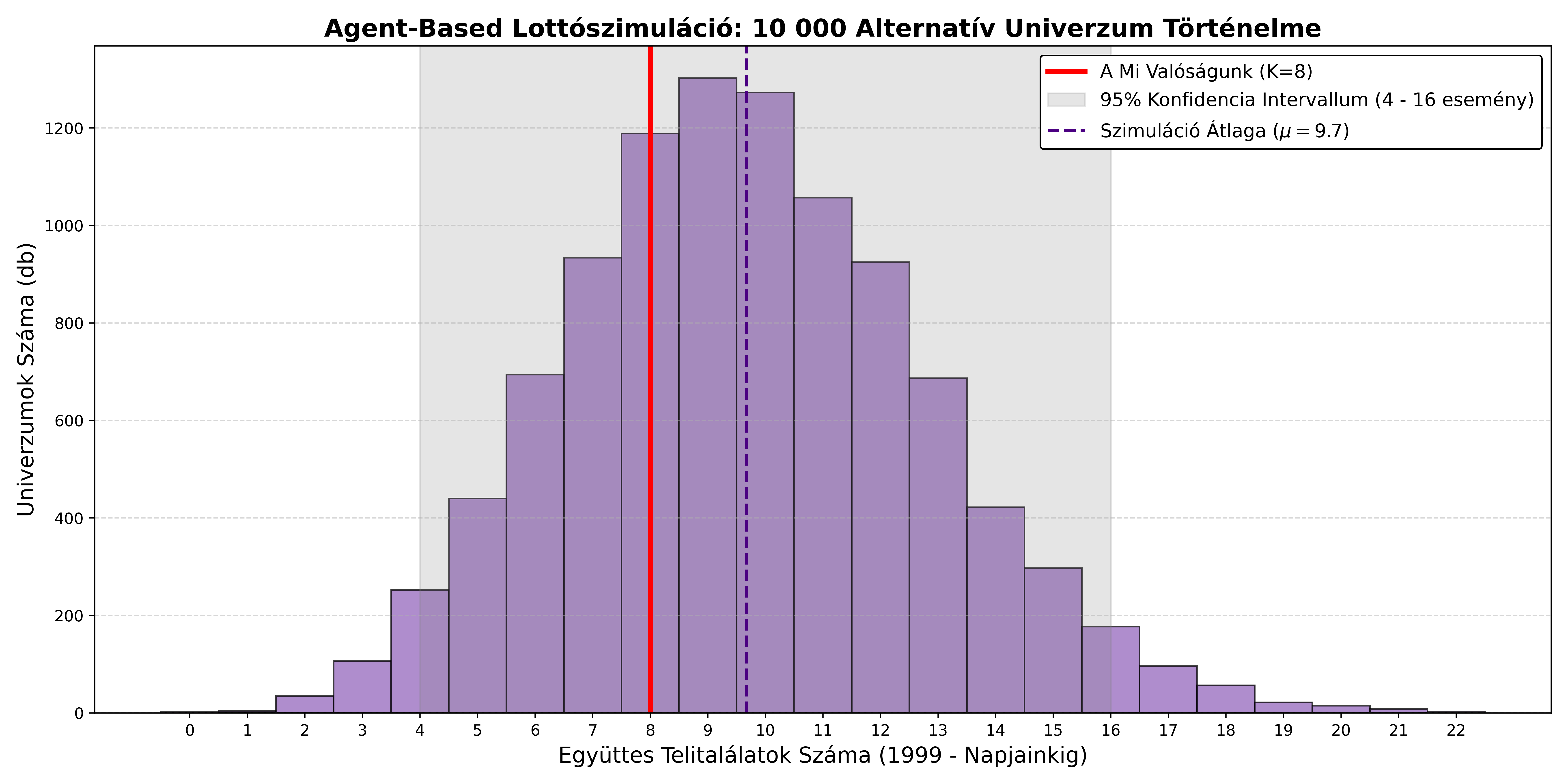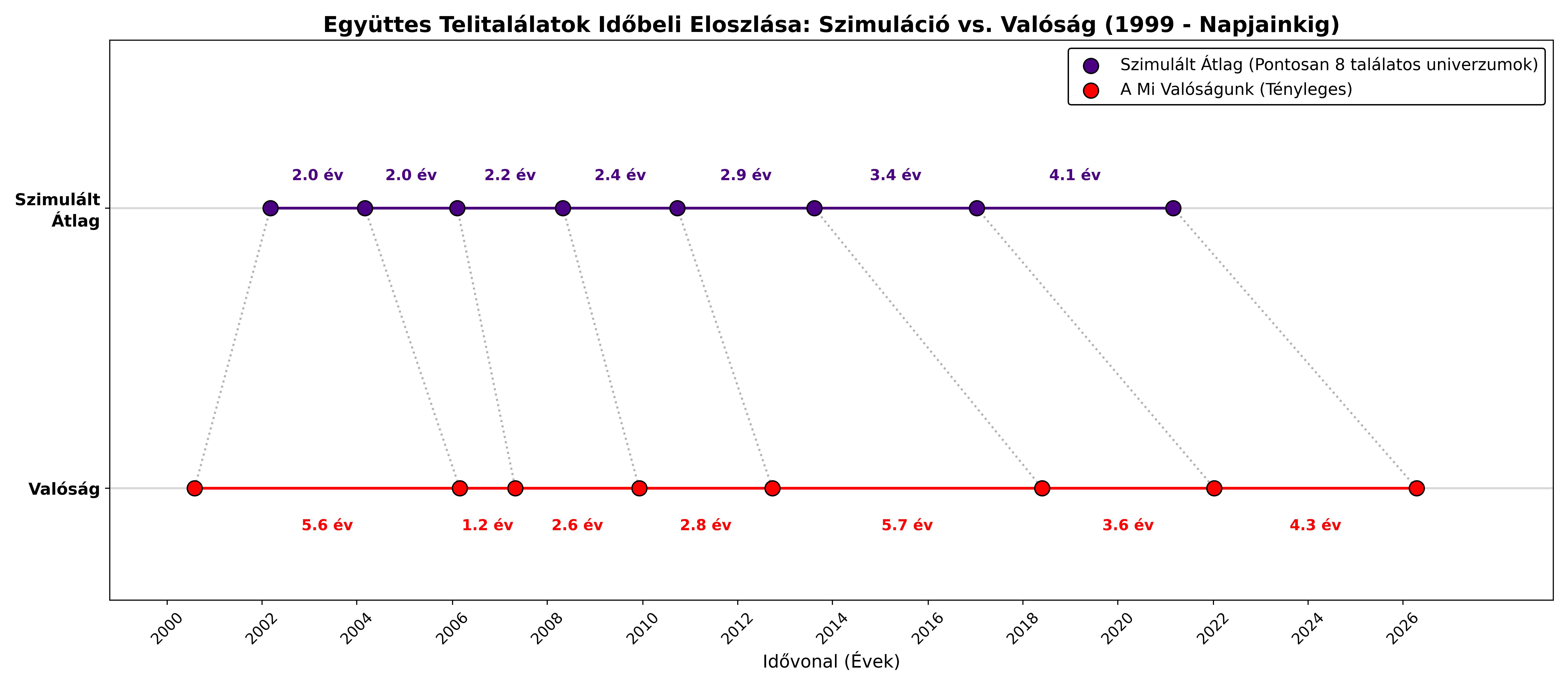 - Szimulált Átlag (Lila pontok): Egy ideális 8-találatos univerzumban a nagy számok törvénye kiegyenlíti a távolságokat, átlagosan 3-4 évenkénti bekövetkezést prognosztizálva.
