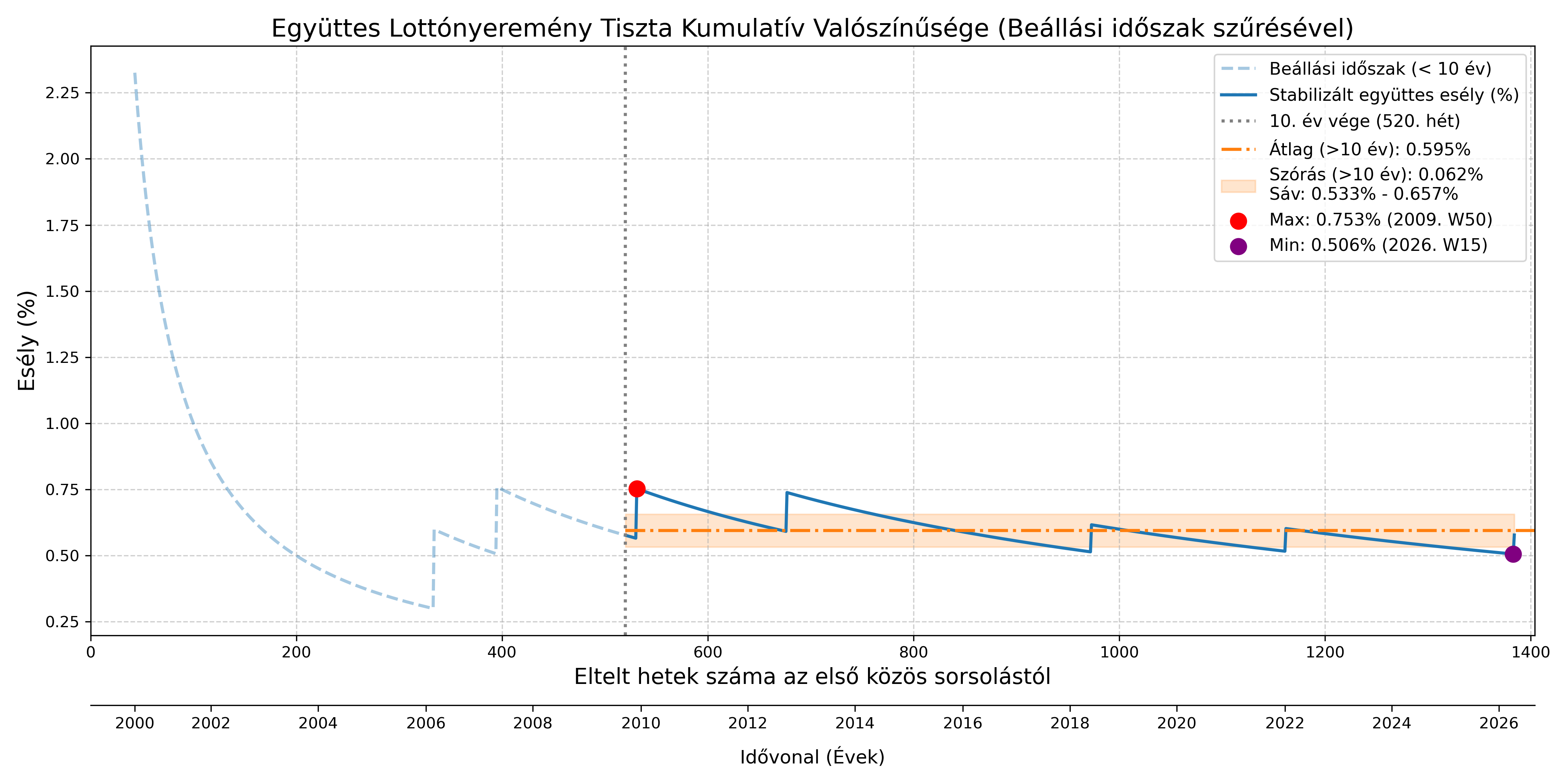 A kumulatív gyakoriság a kezdeti években rendkívül érzékeny: egy kis elemű halmazban egyetlen bekövetkezett telitalálat is irreálisan felhúzza az esélyt, míg a hiánya túlzott pesszimizmust sugall. Annak érdekében, hogy a lottójátékok valódi, hosszú távú trendjét vizsgáljam, a számítást két szakaszra bontottam: